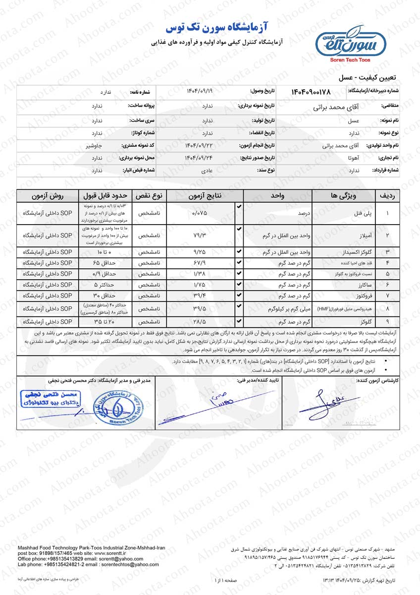 نتیجه آزمایش عسل گشنیز اعلاء ۱۴۰۴